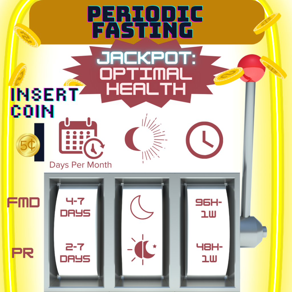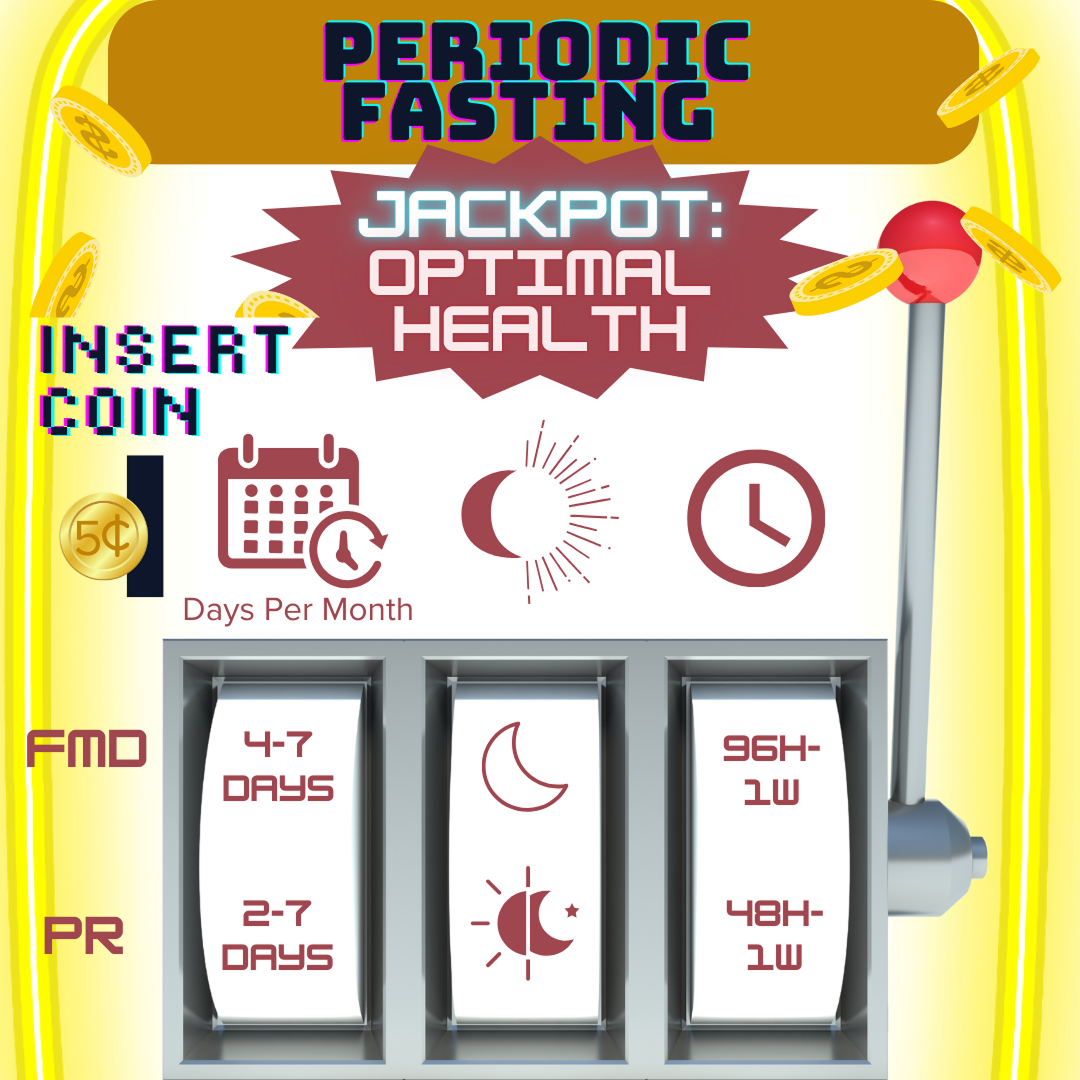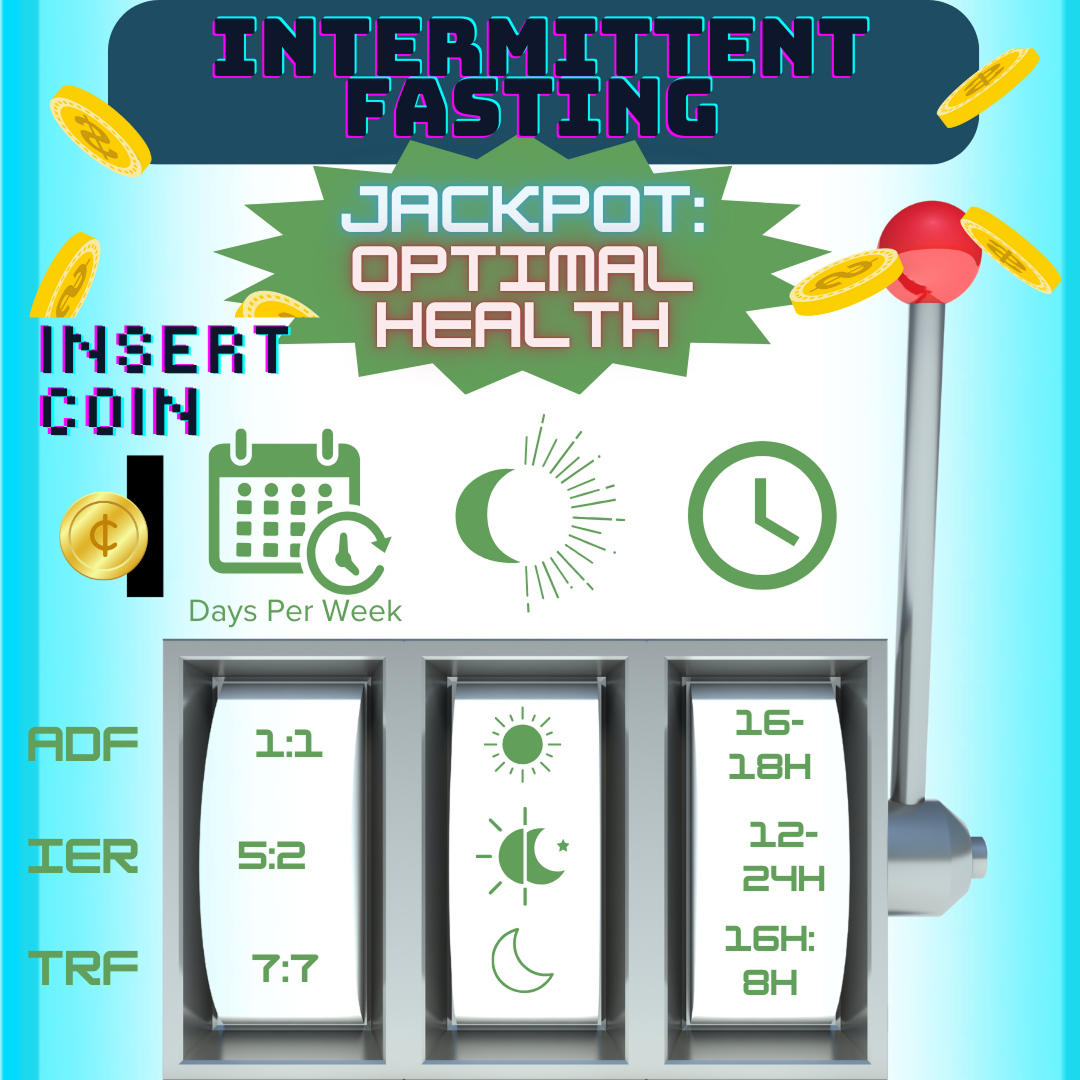 Hitting the ‘Jackpot’ of Fasting Outcomes: Different combinations of the fasting trifecta’s variables will work differently for each person’s biology. The first choice is deciding which ‘slot machine’ to play (the equivalent of choosing which type of fasting to explore). Then we can ‘play to win’ by pulling the lever, which generates a fasting trifecta combination (the equivalent of exploring one combination of the fasting trifecta’s variables). Whether or not this combination is your ‘jackpot’ will be partly determined by which fasting category and associated regimen you chose to pursue, but also by your own unique contributing factors (such as your biology and lifestyle).