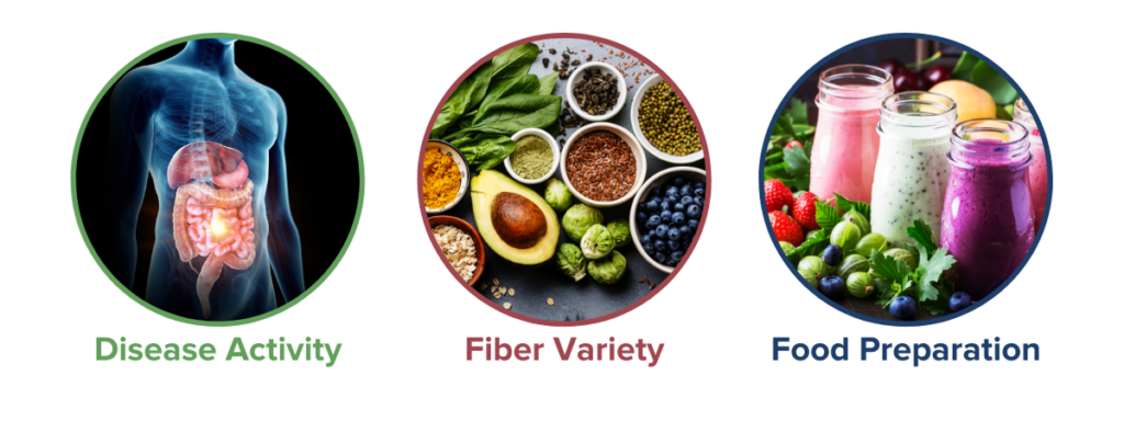 Years of research have demonstrated that certain fiber varieties can fortify the gut’s intestinal barrier, bolster immune function, and fuel optimal microbiome composition. Although there is not enough conclusive evidence to create an official fiber recommendation for people with IBD, the potential of utilizing fiber as an anti-inflammatory therapeutic is quite promising. Of course, some of these beneficial effects may also result from the other nutrients and minerals required for health that are often found in fiber-rich fruits and vegetables. Due to variables like genetics, our unique microbiome, and the incredible heterogeneity of IBD symptoms, there is not a single “best IBD diet.” As always, be sure to speak with your medical team before making any dietary changes, especially for individuals with strictures and intestinal obstruction.