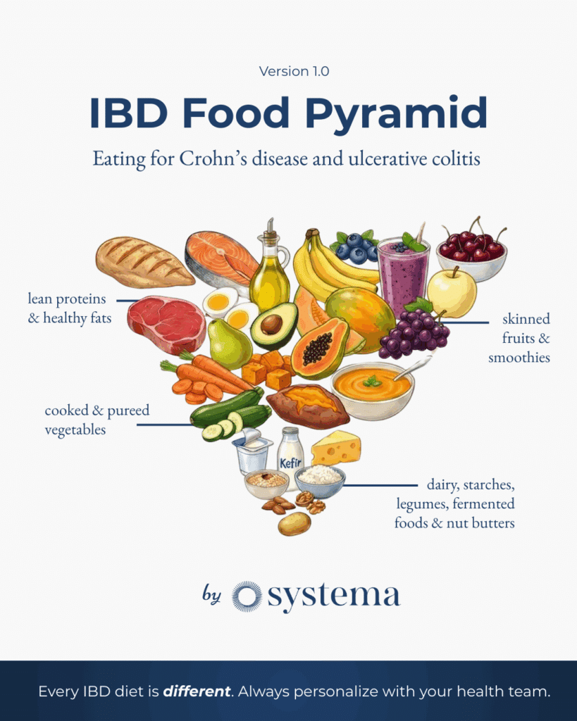 The pyramid puts what most IBD patients should prioritize at the top (the widest section) and what requires more individualized caution at the narrow bottom. Let’s walk through each tier.