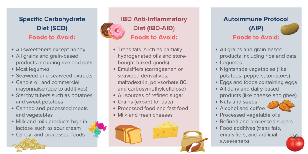 - The IBD Anti-Inflammatory Diet (IBD-AID): The IBD-AID is a more recent and somewhat less restrictive evolution that shares many foundations with the SCD. Like the SCD, the IBD-AID promotes removing certain foods that are thought to promote inflammation and dysbiosis (imbalance in the gut microbiome).13,57