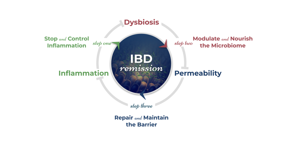 A dysregulated immune response in the lining of the gastrointestinal (GI) tract results in inflammation of the tissue and subsequent symptoms of IBD.4,5 In the runaway cycle of IBD, increasing intestinal permeability allows things like bacterial particulates to leak across the intestinal lining, triggering an immune response against the invading particulates.6,7 This immune response leads to inflammation and tissue damage. Dysbiosis of the microbiome, or an imbalance of the microbes that inhabit the GI tract, can further contribute to rising inflammation and disruption of the intestinal lining. As inflammation increases and the lining becomes more damaged, more harmful particulates can leak across the barrier and continue this cycle. The most effective IBD protocols must attack all three parts of the IBD cycle: