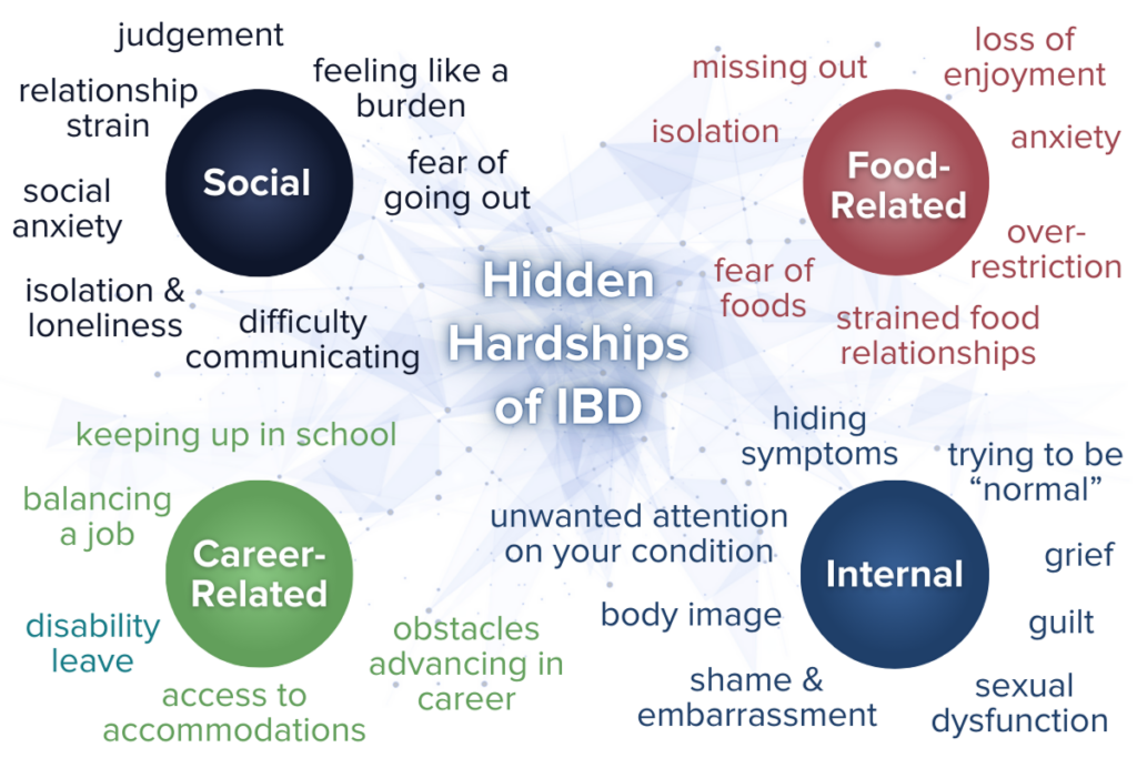 Inflammatory bowel disease is not just a gastrointestinal condition. The effects of living with a chronic, lifetime condition like IBD are far-reaching. IBD impacts all facets of life: social relationships, intimate relationships, family dynamics, career goals, educational opportunities, self-love, body image, and more. These are all more difficult to navigate when living with such a complicated, mysterious, and incurable condition. Many resources for IBD care leave out these facets of life with IBD. They assume that if the IBD is being effectively treated, all else is fine. This is simply not true. The physical symptoms of IBD are hard enough, but in many cases, the hidden side effects of IBD can be even more burdensome.