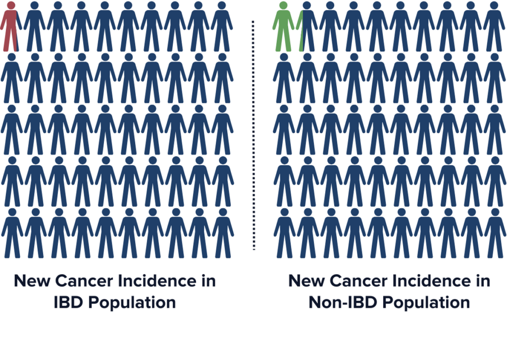 IBDers may be at increased risk for developing certain cancers, especially colorectal cancer.36 The risk of developing cancer in people with IBD is increased by disease severity, prolonged intestinal inflammation, and increased duration of active/uncontrolled disease.38,39 Certain medications for IBD are also associated with an increased risk of cancer.53,54
