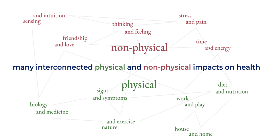 Systems thinking is also the well known fundamental paradigm that the whole is greater or entirely different than the sum of its parts. There are delicate physical and non-physical relationships where components are interdependent, with each element a system in itself. These relationships are often invisible, and so can be unintentionally disrupted and harm the integrity of the system (i.e. the emergence of chronic disease). Below are some physical and non-physical relationships pertinent to a human being’s health in the 21st century: