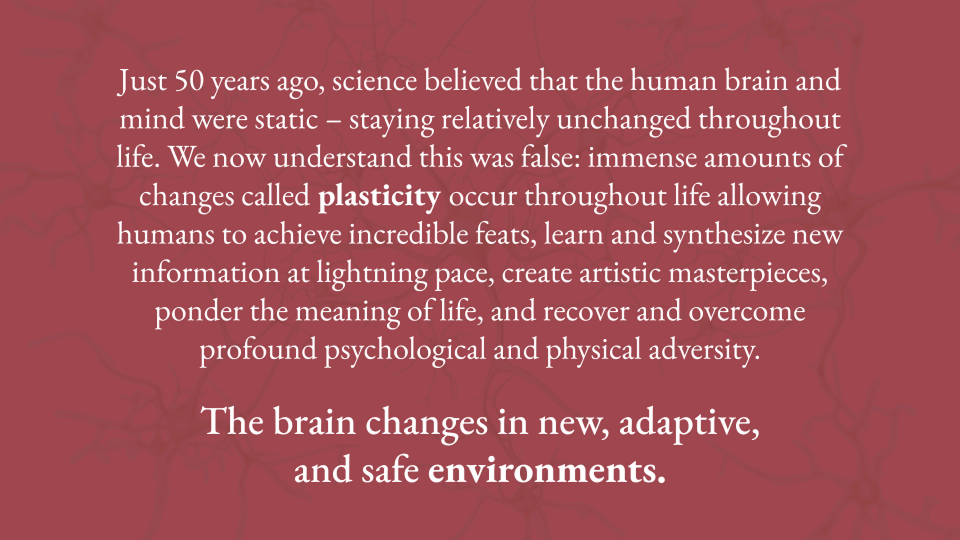 And the best way to change a human being is to change the brain. As someone who studied the fundamentals of neuroscience, I know the brain can profoundly change when exposed to new more adaptive environments. This process is called Neuroplasticity.